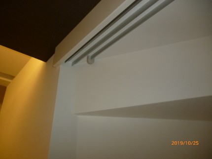 床のフロアレールの上、天井部にはL型のガイド用の金具をビス止めしていきます。奥の左側のレールは階段の下部が斜めに、セリ出してきていますので、少し手前でカットして、ゴムの戸当たりをつけました。