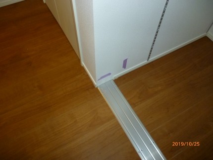 キッチンの3枚引違い戸を取り付けます。最初に床にフロアレールを取り付けします。