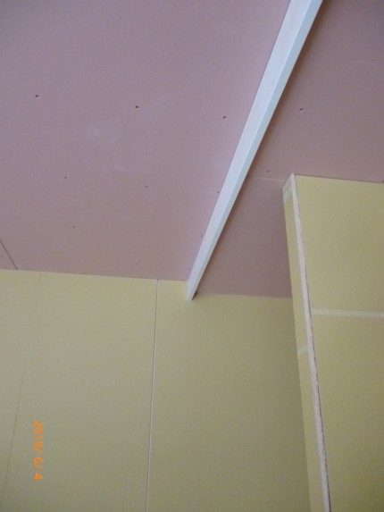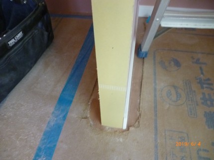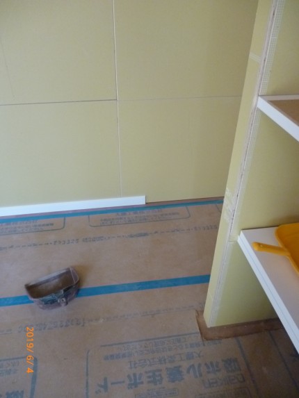 間仕切り壁の手前に被さるように引戸を取り付けるため、巾木は手前には貼らないように、事前に打ち合わせしておきます。内部の壁の正面に巾木が来ると、巾木の上部に大きな隙間ができるからです。打ち合わせ通りの仕上がりです。