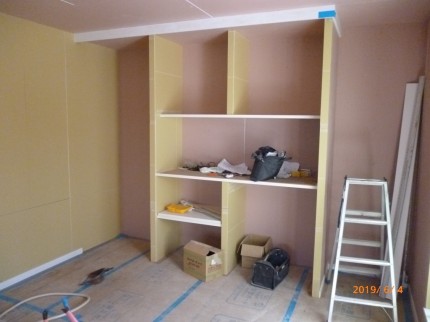 キッチンの背面に3枚引違戸を取り付けするので、現場調査に行ってきました。現状は収納の内部の間仕切り壁を大工工事で製作してます。間仕切り壁の幅と高さ、奥行を細かく測っていきます。