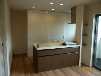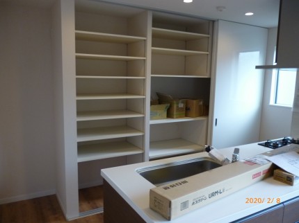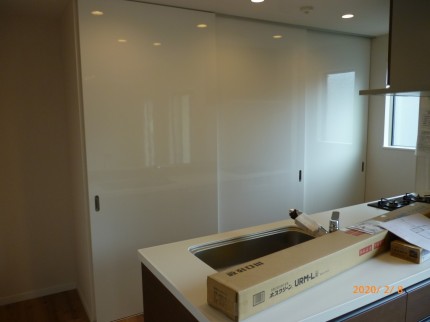 キッチンの背面に取り付ける3枚引き違い収納の建具を製作、取り付けしてきました。
