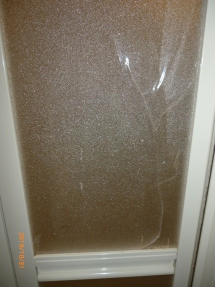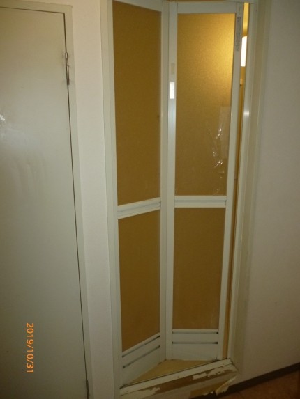 マンションの浴室折戸の不具合ヶ所の点検をしに行きました。この折戸は既製品の浴室折戸ですが、樹脂の窓が割れてました。