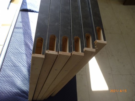 出来上がってきた6枚の引戸です。下部養生の木材を外して戸車を取り付けます。