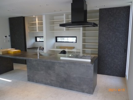 鏡面材はチャコールブラックの石材の柄のメラミン化粧板です。キッチンも同様のブラック系の色です。