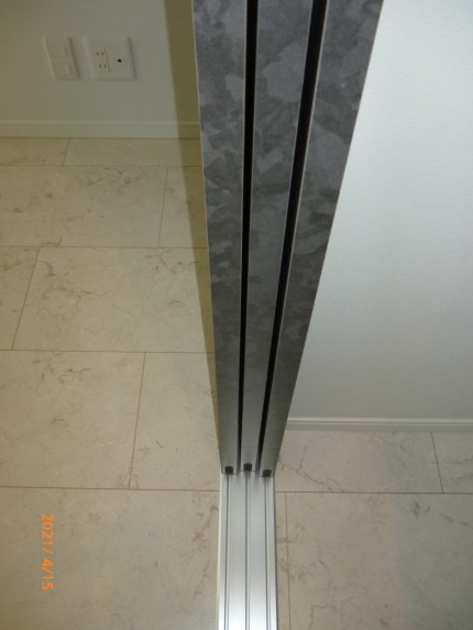 上部のガイドレールと平行になるように、何度も建具を転がせて微調整します。平行がずれると抵抗で走行が重くなります。