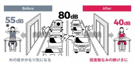 YKK APのカタログより、左のようにプラマードUを取り付けることにより、図書館なみの静けさになる実験結果が表示されています。