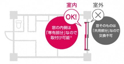 分譲マンションにお住いの方は内窓は付けれないと思っていらっしゃる方も多いと思います。厳密に言えば、そのマンションの管理規約を見ないと断言できませんが、左の絵の様に窓の内側が専有部分のマンションが多いと思います。一度マンションの規約をご確認ください。