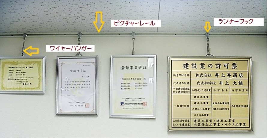 ランナーフックはピクチャーレールの中を好きに動かせるので間隔を空けて飾る時にも便利です。