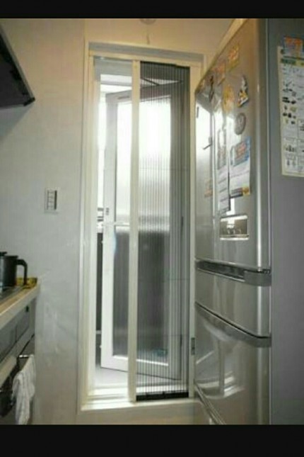 キッチン周りに勝手口がある家でも、扉の吊り元側(丁番側)に網戸が収納される設計になっているので、邪魔にならず、より換気することができるかと思います。