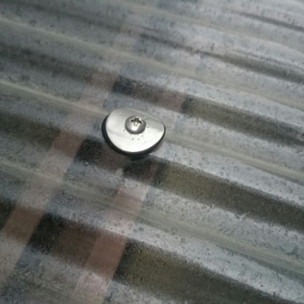 波板を外していくには、波板を止めてある波板フックを外していかなければなりません。写真で見ていただく通り素材はステンレスでできており、 躯体にひっかけてドライバーで半回転して止め、 耐久性に優れているものです。