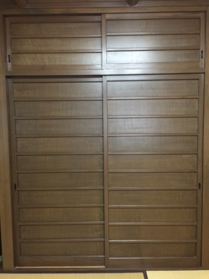 天袋付の 板戸風建具を民芸調に、こげ茶に塗装仕上げしました。