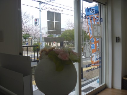 会社前の桜 入口のマイボーカ硝子 から花見|