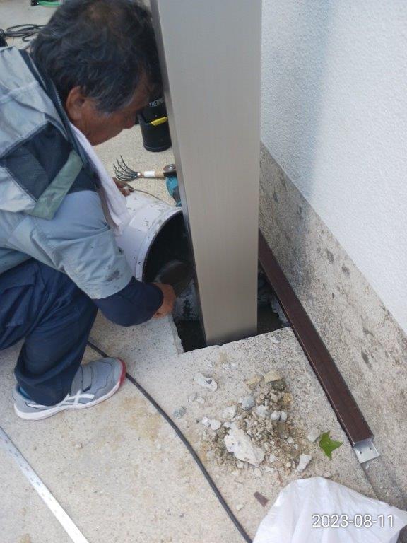 柱を設置しましたら、セメントを流し込み固めます。柱を固定します。固まってからでないと屋根など上部の作業はできません。基礎の大事な作業です。この掘削作業が新製品のカーポート プレーンルーフにはない作業となります。これからはシンプルなカーポートを見かける機会が増えそうですね。
