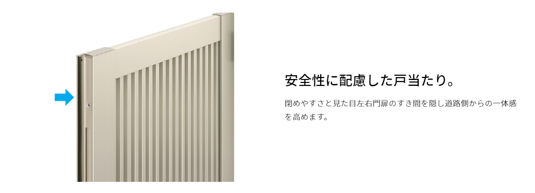 安全性に配慮した戸当たり 隙間を隠し門扉の外から見た外観の一体感を出します。