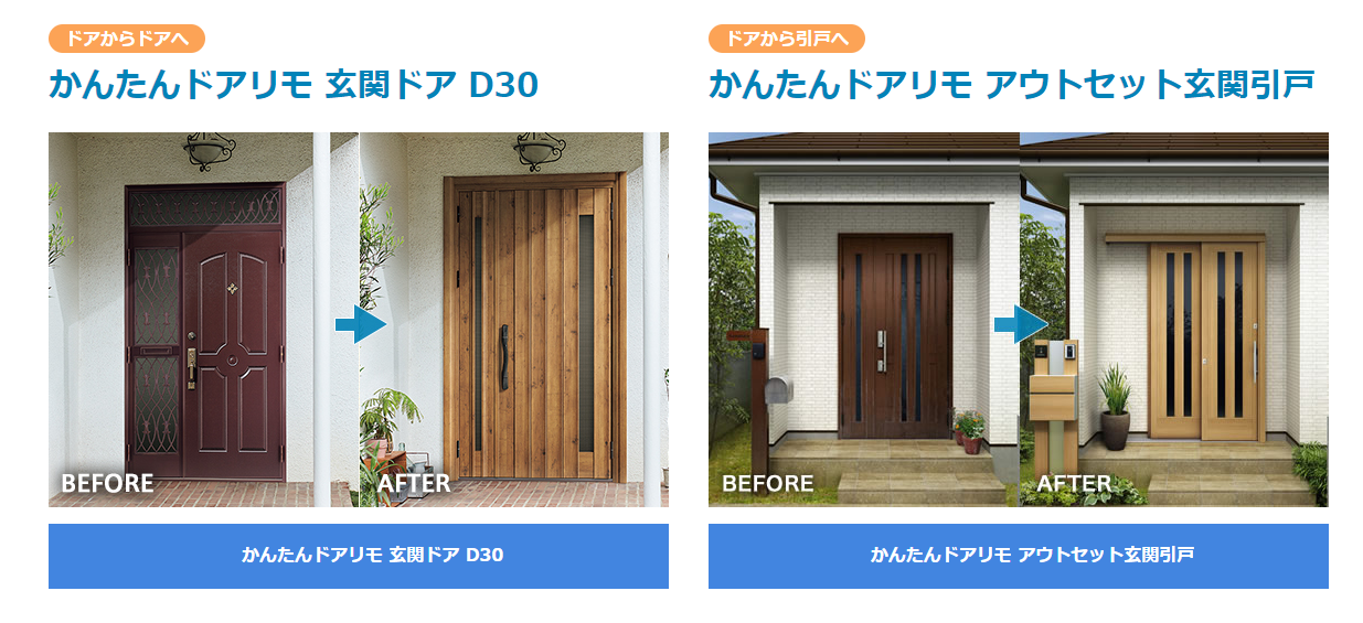 玄関ドアリモには、ドアと引戸のカバー工法がございますので、現在引戸でも取替は可能となりますし、ドアから引戸へも引き込むスペースがあれば施工は可能となります。