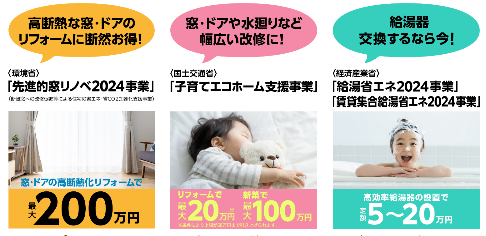 どのような省エネリフォーム事業なのか?今年も3つの省から出ます。国土交通省・環境省・経済産業省からとなります。住宅省エネ2024キャンペーンは4つから成り立ちます。