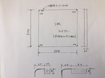 (製作図)このような300角位の開口が開いてます、その下に 物が入れれるようになっていましたが、物を入れることが無くなりましたので、穴をふさぎたいと・・・ご希望でした。