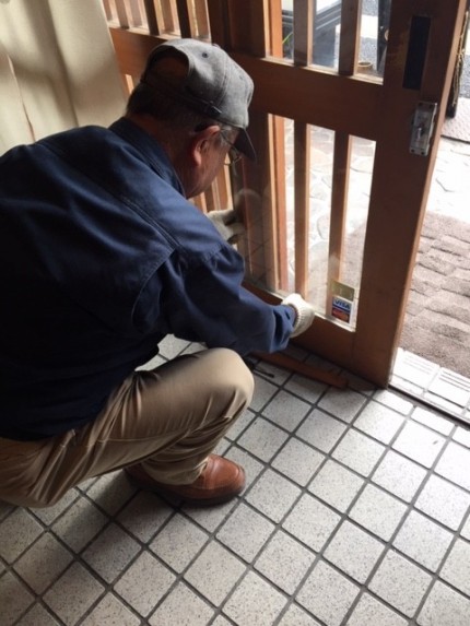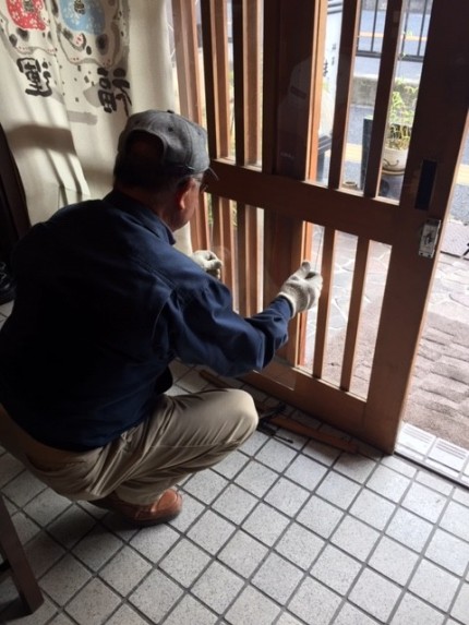 木製建具は、戸をはめたままで交換ができる仕様でしたので重たい硝子戸を外さなくてすみ助かりました。