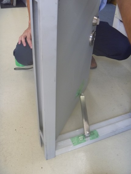 鉄扉を開けた時に、扉が止まるようにしたいので、アーム状の金物を取付けます。