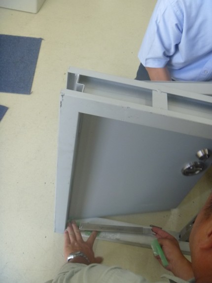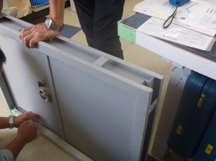 オーダー鉄製扉のステー・調整器 ベテラン営業マンとベテラン職人さんが念入りな打合せをして、商品を探します!吹田市
