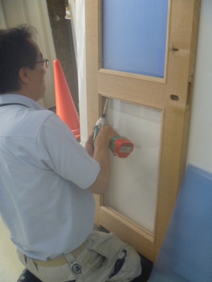 硝子おさえでポリカツインカーボを止めで、丁番・レバーハンドルを現場で取付ます。