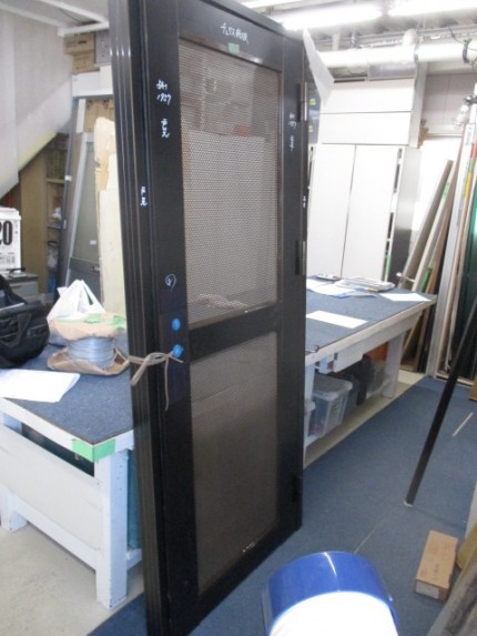 アルミフロント片開きドアにガラスではなく、今回はアルミパンチングパネル1.5mm厚さの物をコーキングで仕上げます。外部、自転車置き場に取付する為、風が抜けるように穴を開いた物を使用します。