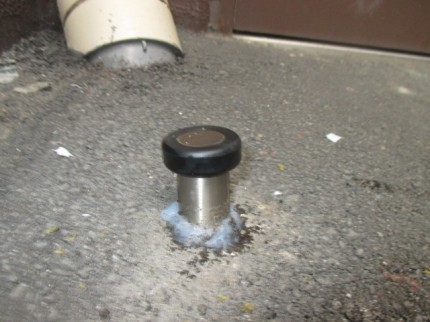 続きまして、スチールドアが排煙窓の開いた状態の時に当たらないようにする為、90度以上、開かないように戸当たりを床(地面)に取付しました。