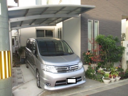 お客様と相談した結果、既存カーポート屋根の長さを500mm加工して短くします。掃出し窓シャッターの上部にテラス屋根(奥行1200mm)をカーポート屋根に200mm掛かるように取付します。屋根を受ける柱はカーポートの屋根を少し隙間を開けて設置しました。初日はこれにて終了です。大阪府 高槻市