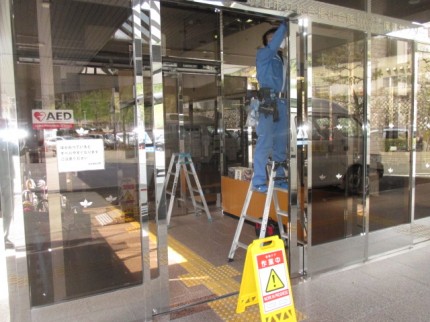 自動ドア(扉)を2人作業で取り外します。扉が重い為、必ず2人で行います。鍵は下部に付いていますので、扉の下部を見えるように置きます。