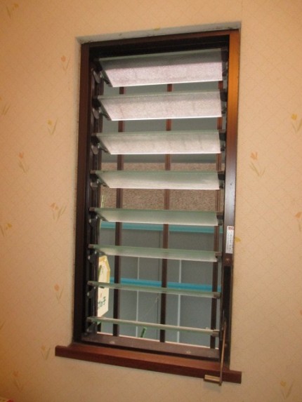 ガラスルーバー窓から入る隙間風が寒いとご相談のお電話を頂きました。現場にてお話を伺うとルーバー窓のガラスとガラスの間からとハンドル箇所からが隙間風が入ると言う事でした。その後、採寸をさせて頂き、寸法を確認した所、幅が280mmとかなり狭い仕様になっています。高さも低い為、幅を外部アルミ部分をカットして広げてからYKK AP断熱サッシ『エピソード 内倒し窓』仕様で取付する事をご提案しました。大阪府 高槻市