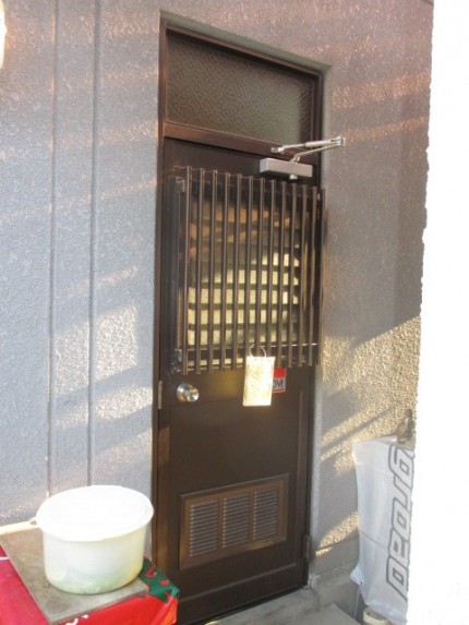 勝手口ドアの事で相談したいとお電話を頂きました。現場にて確認しますと以前に框ドアの上部から風を取り入れる為、パネル材を外し、ガラスルーバー窓を取付していました。ルーバー窓の隙間風と下部にアルミ換気ガラリが付いている為、夏場は良いのですが、冬場はすごく寒い、勝手口廻りだけではなく、玄関まで寒さがくると言う事でした。