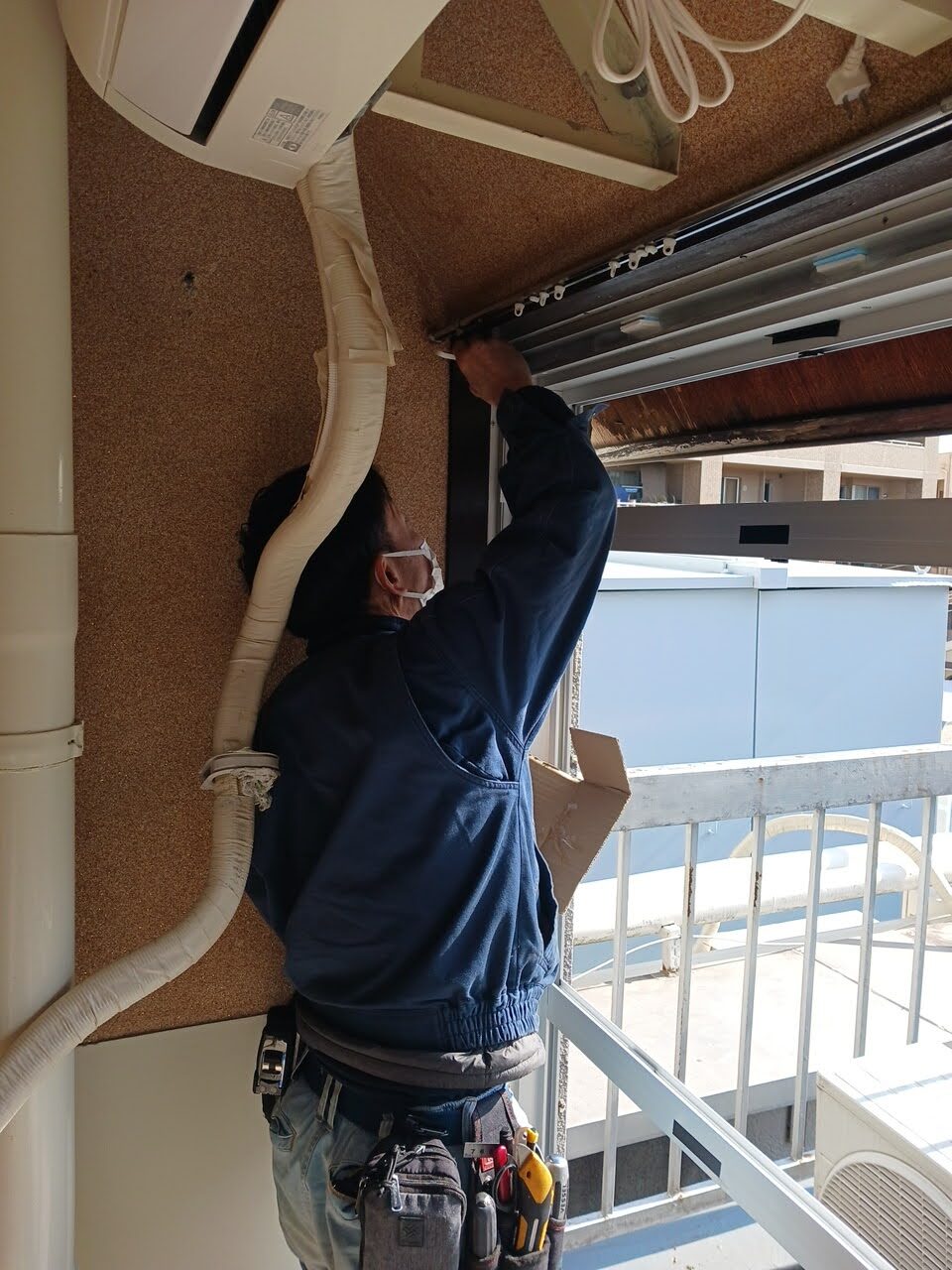 現状を確認すると、3枚建てのタイプで窓の一番端からエアコンの配管が出してあり、窓の鍵を閉めることができない状態でした。