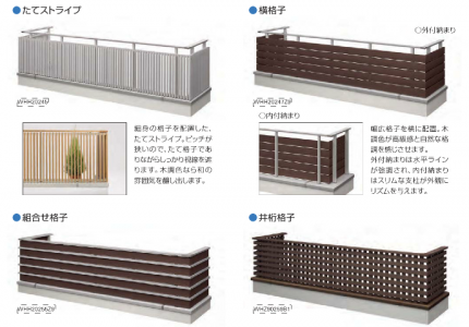 今回、YKKAP製笠木付ハンドレールをオススメしました。既存のデザインに類似した横格子や横太格子、また、縦格子、井桁格子など多くの格子デザインバリエーションがあり、商品色は、木目ラミネート材4色、アルミ形材色5色の計9色があり、和風建築、洋風建築どちらにも対応可能です。また、笠木を取り付けることにより雨水の侵入を防ぎます。是非、皆さんもベランダのメンテナンスのお悩みをご相談下さい。