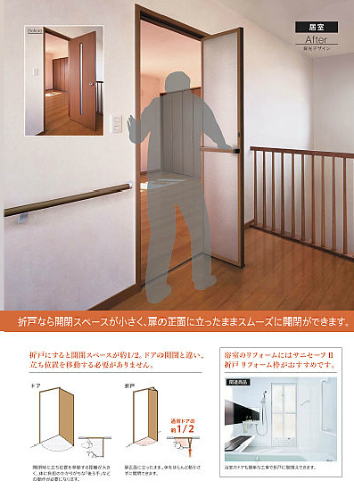 折れ戸にすると開閉スペースが約半分になり、ドアの開閉と違い立ち位置を移動する事がありませんので、お年寄りの苦手とする後退動作がなくなり怪我の抑止にもなります。