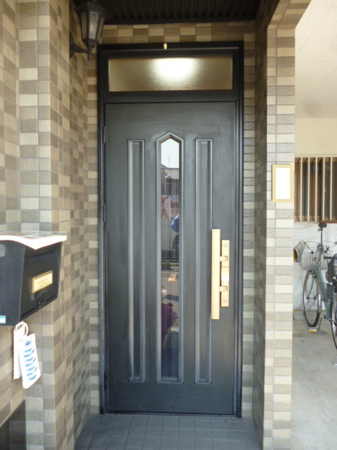 現在の玄関ドアです。ドア本体が色あせし・所々剥がれてきているので取替のご相談でした。今回、既存と同じランマ付のykkapドアリモ断熱・手動錠タイプ、キャラメルチーク色(木目)お勧めしました所、ご採用頂きました。次回施工後写真を掲載させて頂きます。