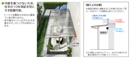 特徴① 外壁を傷つけない為、住宅の10年保証を気にせず設置可能です。透明計屋根ふき材なら屋根下に色が映りません。紫外線をカットしながらも光を通すので、リビング内も明るくします。