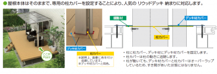 特徴② 屋根本体はそのままで、専用の柱カバーを設置することにより、人気のリウッドデッキ納まりに対応します。是非、参考になさって下さい。