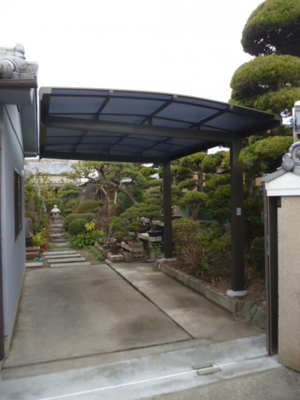 施工後 フーゴAレギュラーは屋根形状の丸みが有り和風のお家に最適です。商品色はオータムブラウン、屋根材は日差しを遮る効果のある熱線吸収ポリカーボネートを選択されました。お庭の植え込み部に柱を設置することで、お車の駐車スぺースを狭くすることも無く出入りもスムーズです。施工は1日で完了したので、その日の内にお車を駐車出来て大変喜ばれていました。色々な敷地に対応可能な様々サイズとデザインのカーポートが有りますので、是非ご相談ください。