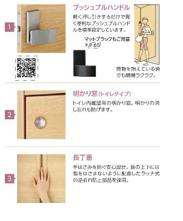 ①プッシュプル錠 押す・引くという1つの動作で開閉できる、操作性の良いプッシュプル錠を標準設定しています。②明かり窓(トイレタイプ)を取付することが可能です。③長丁番 手はさみ防止として、安全・安心設計長丁番(アルミ形材)を採用。扉の上下には指を挟まないように配慮した、ラッチ式の逆折れ防止部品を採用しています。アルミサッシだけで無く、木製インテリア建材も是非お問い合わせ下さい。