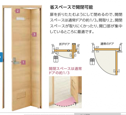 YKKAP製 木質インテリア建材ラフォレスタの機能ドアのご案内です。今回は折戸ドアです。省スペースで開閉可能。開閉スペースが少なくてすみます(通常ドアの約1/3)ので間取り上、開閉スペースが取りにくかったり、開閉部が集中しているなど、通常のドアでは使い勝手が悪い所などに最適です。通風可能なガラリや明かり窓も取付出来ます。