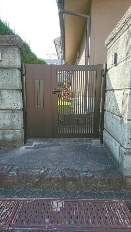 既存スチール製親子開き門扉が長年の使用で腐食が目立ち、何度も塗装をして補修してきましたが、今回、破損部も目立ち始めたので、交換したいとのご相談でした。ykkap製シンプレオ門扉をオススメしましたところ、ご採用頂きました。
