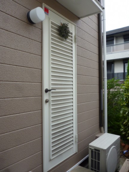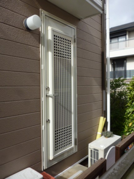 施工後 lixil製リフォームドアリシェントパンチングタイプ取付しました。複層硝子仕様で断熱効果も上がり、錠も2ヶ所有、防犯面も向上しました。