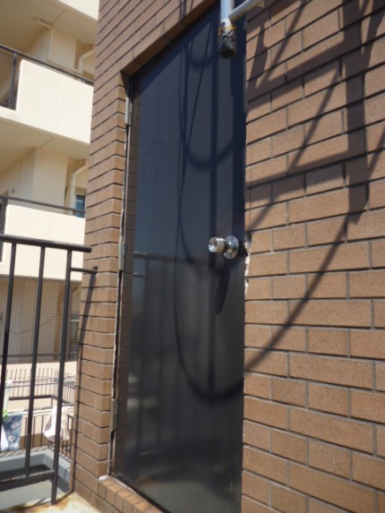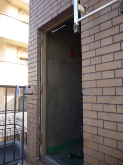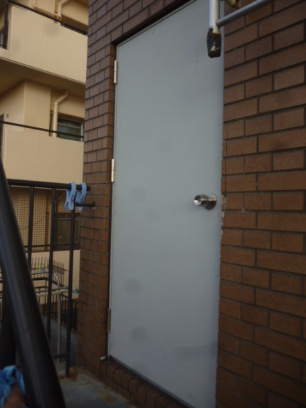 施工後 既存の枠の内側に新しい枠を取付、ドアを吊り込み、ドアクローザを取付、開閉確認をして、最後に枠廻りに雨が侵入しない様にコーキングをして完成です。スチールドアの取替も是非ご相談下さい。