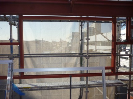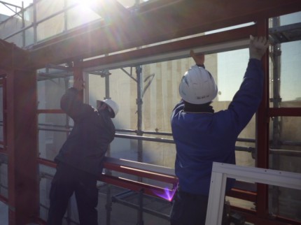 施工中① アルミサッシ枠をC形鋼材で作られた開口部にはめ込みます。次に縦レベル・横レベルを合わせ、対角線寸法が合っていれば外側からビス止めしていきます。現場は常に安全の為ヘルメット着帽です。
