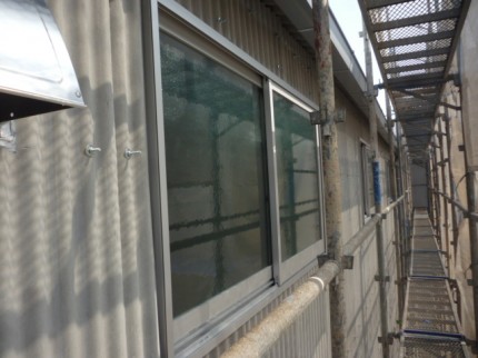 施工後 サッシ枠に硝子障子をはめ込み、戸車で最終調整し取付完了です。サッシ取付完了後、工場外部面に波板スレート材を取付けた写真です。