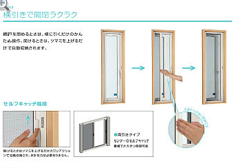 今回、YKKAP製横引きロール網戸をおすすめしました。横引きで開閉楽々、マグネットレスの新可動桟固定方法で、ワンクッションの簡単操作で開閉出来ます。特に開ける時はツマミえお上げるだけで自動収納され余計な力は必要ありません。