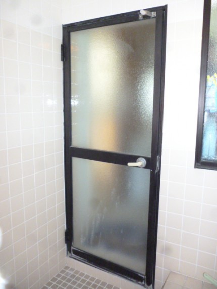 施工前 既存浴室片開きドアです。丁番部が折れて開閉に支障がででお困りでした。ドア本体の上下部には硝子が入っているので重たく、割れると危険なので良い商品は無いでしょうかとのご相談でした。