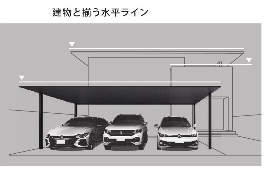雨樋一本の柱設計で工法に柱が納まり、車の出し入れやドアの開閉時にも邪魔になりにくく、柱間寸法は4mを実現(奥行50サイズの場合)