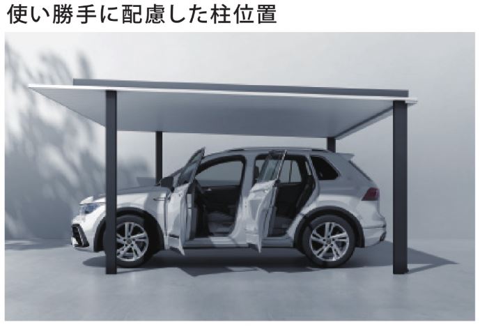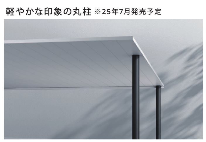 柱はYKKAP独自の屋根下に納まる構造で、水平屋根を独立柱で支え、より建築的な意匠を追求しています。乗降スペースにも屋根がかかり、雨風の吹込みも抑制できます。7月にはカーポートの存在感を和らげる丸柱も発売予定となっています(^^)