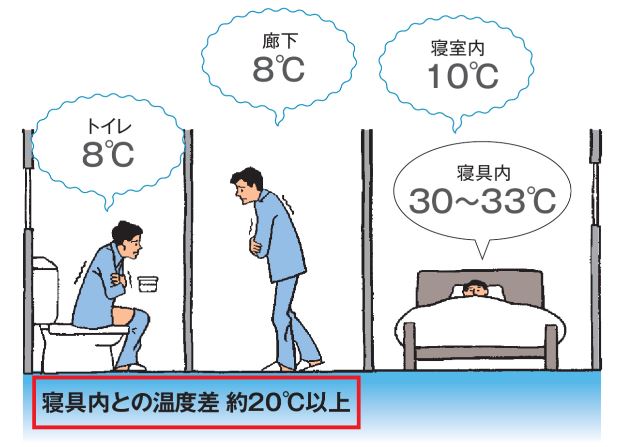 せっかくトイレを使いやすくするなら空間ごと快適にしませんか?冬の室内間温度差の理想は約2~3℃です。寒くなると夜にトイレにいくのを躊躇してしまうことはありませんか?断熱性が低いお家だと布団の中と廊下・トイレの温度差は20℃以上になることも(>_<)その急激な温度変化が血圧や脈拍を変動させヒートショック現象を引き起こす可能性もあります。